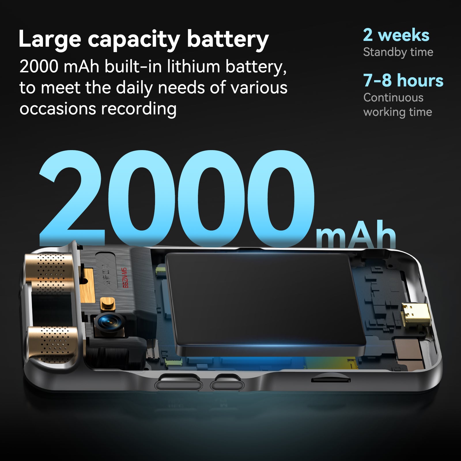 Compact body design: Featuring a sleek aluminum body and a large 5-inch HD full-touch screen with an 8-megapixel rear camera that syncs photos during recording. With ample 16GB of storage and includes a complimentary 64GB TF card, you can record up to 300 hours of video. Plus, you can record up to 8 hours of continuous audio on a single charge.