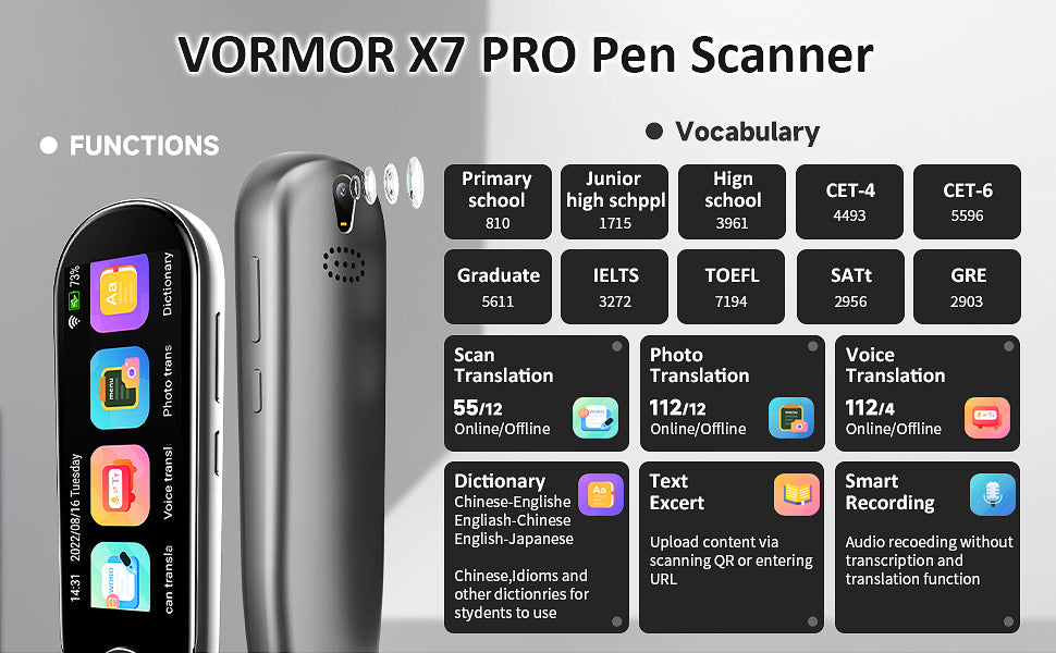 • Over 112 Languages -vormor reader pen supports online voice translation in 112 languages, recorded translation in 112 languages, scan translation in 55 languages, and offline scan translation in Chinese, English, and Japanese. for the TOEFL, IELTS, and ESL tests.