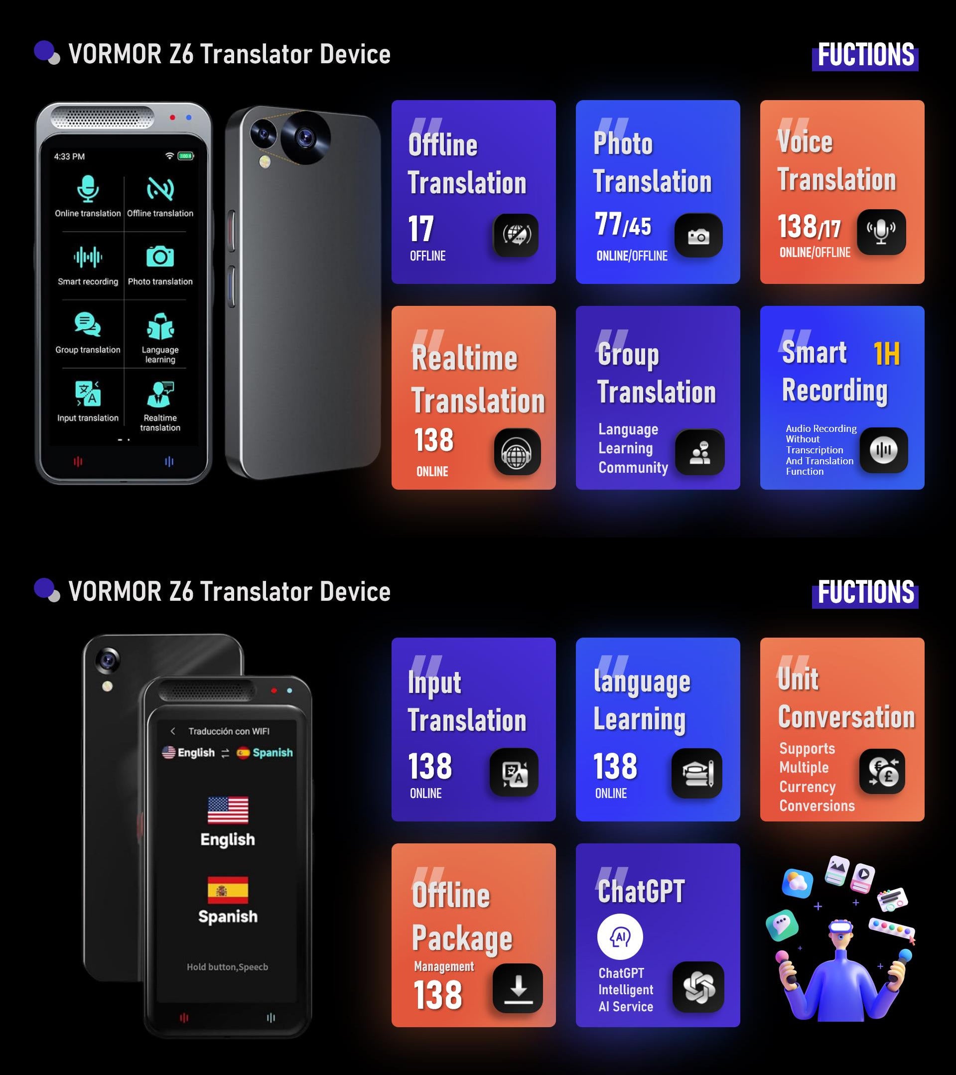VORMOR Z6 Mobile phones Language Translator Device, Portable Translator Device with 138 Languages & 4.1" Touch Screen, Smart Voice Photo Translator Real Time, Offline Online Translation for Business Learning Travel (Black)