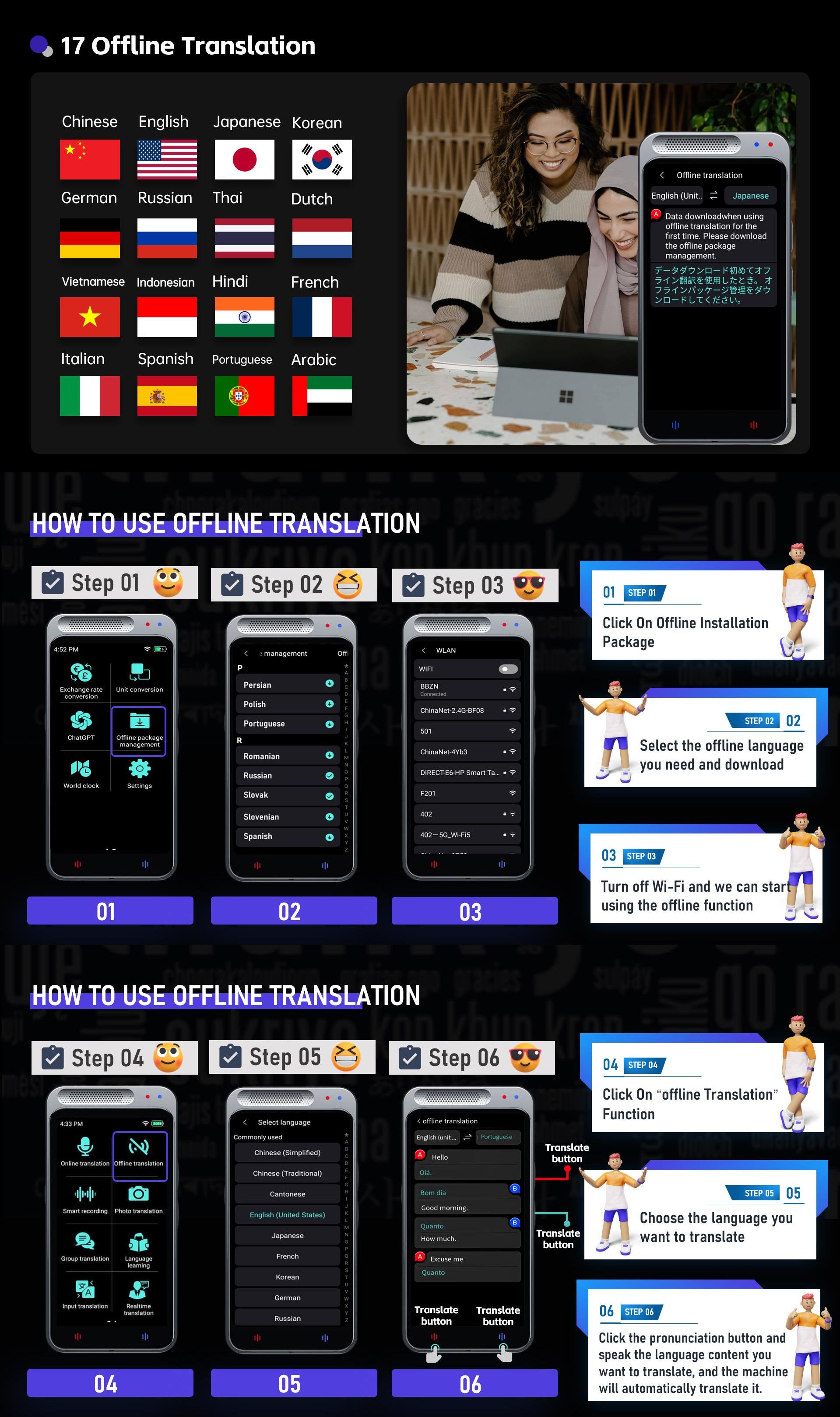 Built-in neural network translation,Ā 138 languages (17 offline languagesļ¼Ā are translated to each other, and the languages cover the world. At the same time, there are multiple servers in China, Southeast Asia, America, Europe, etc., making translation more smooth and stableĀ Ā Ā