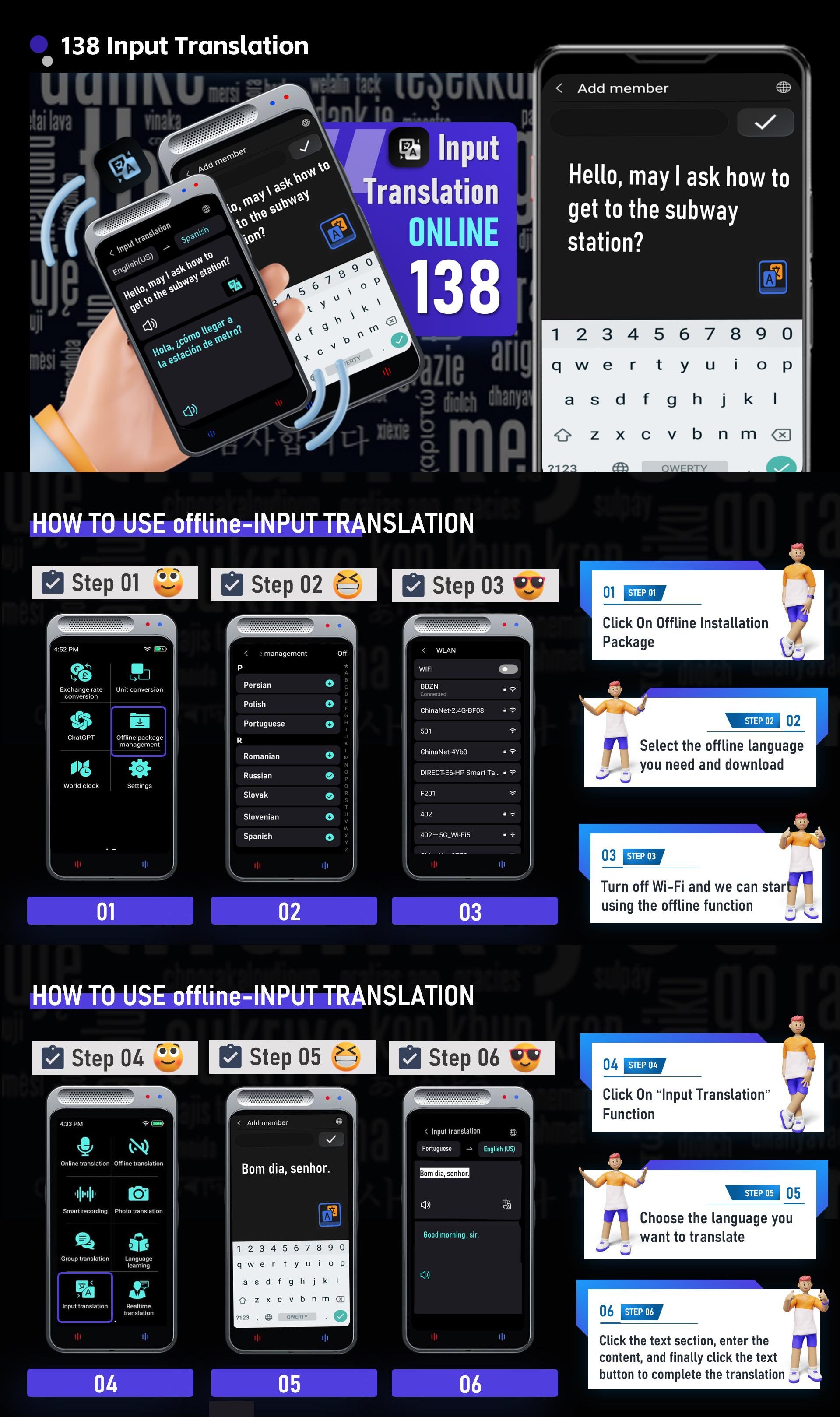 - Input translation: Support Ā (138 languages) input text, automatically translate it into the corresponding language, and read it aloud